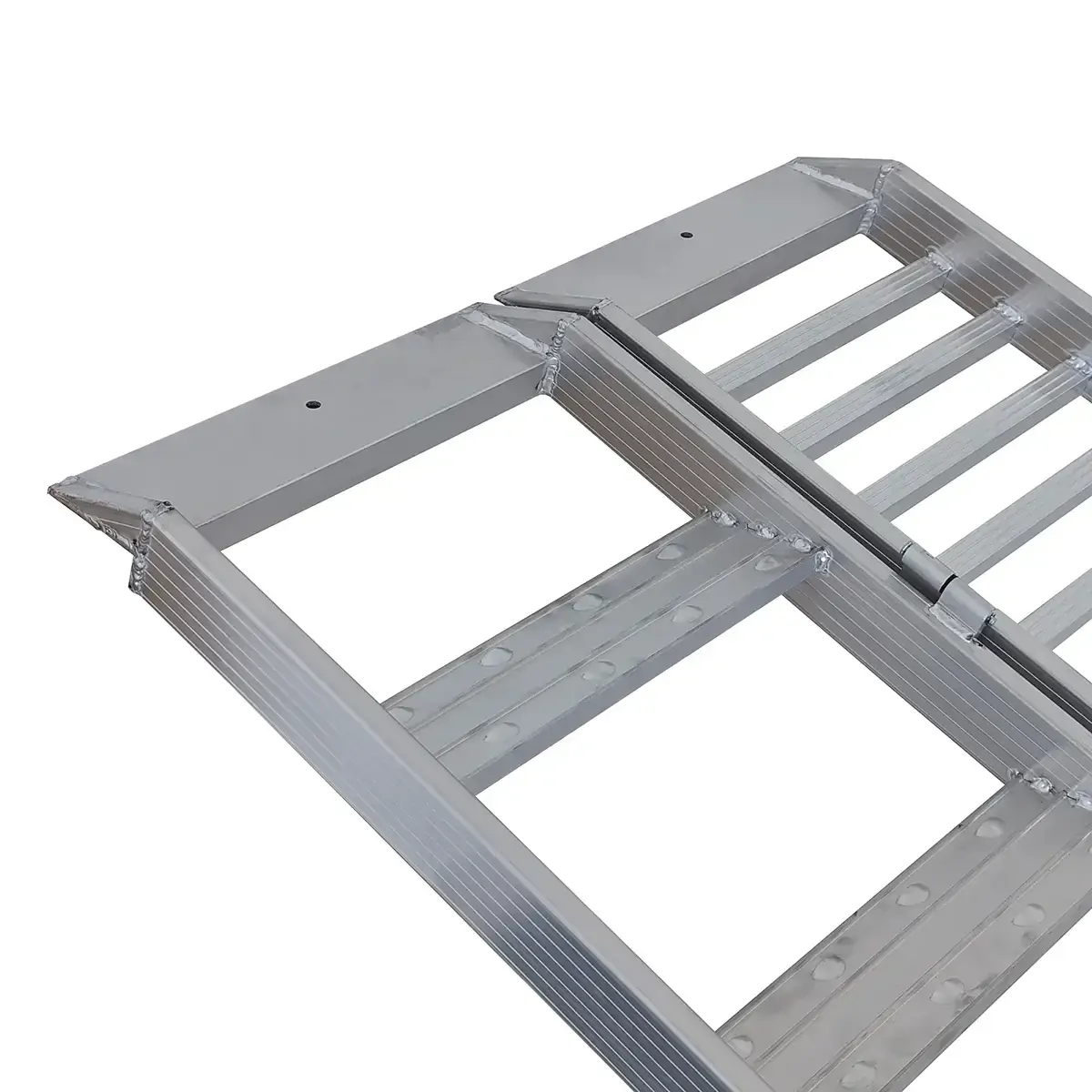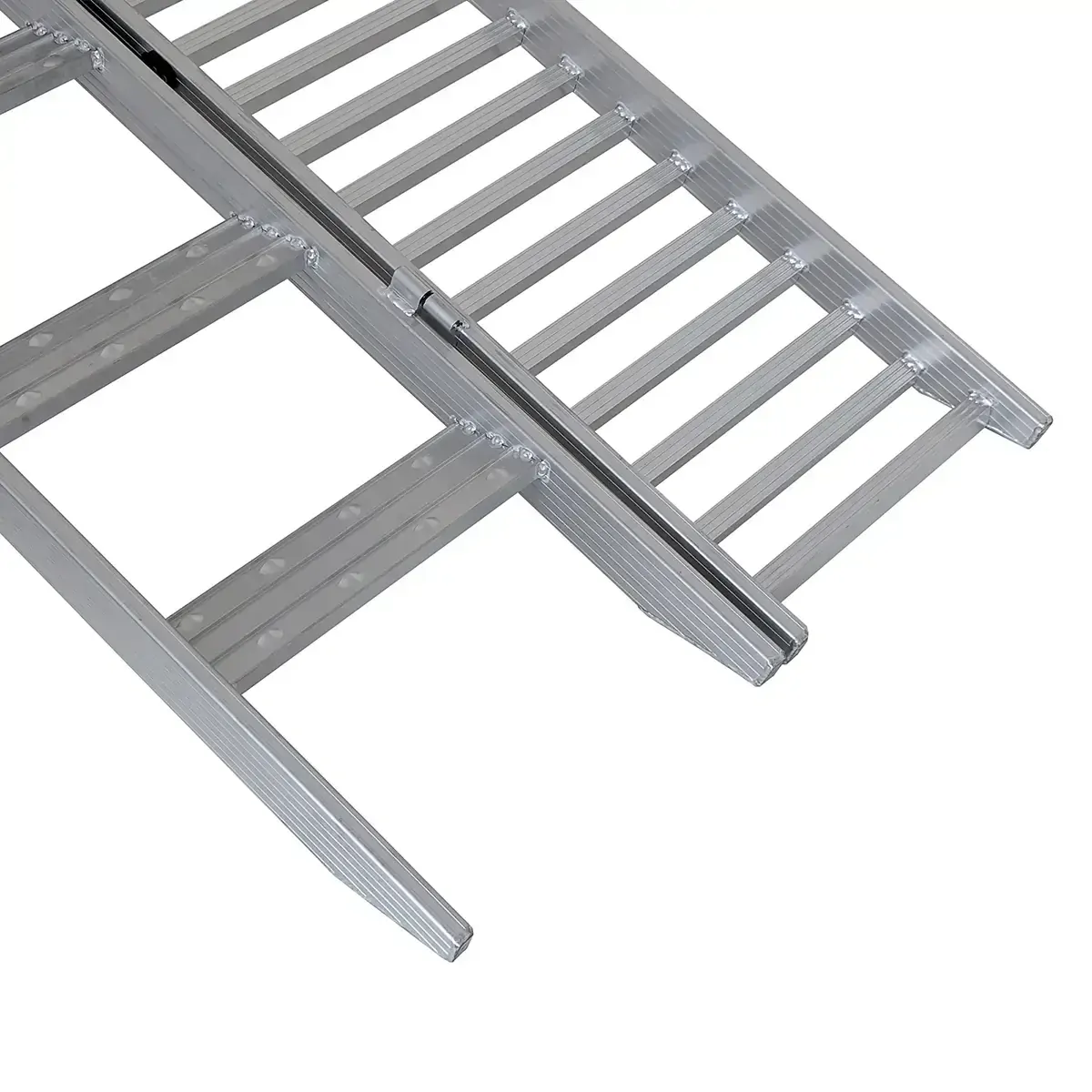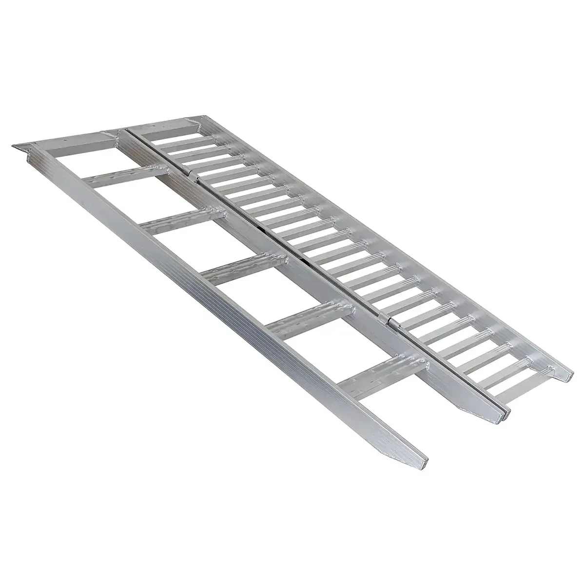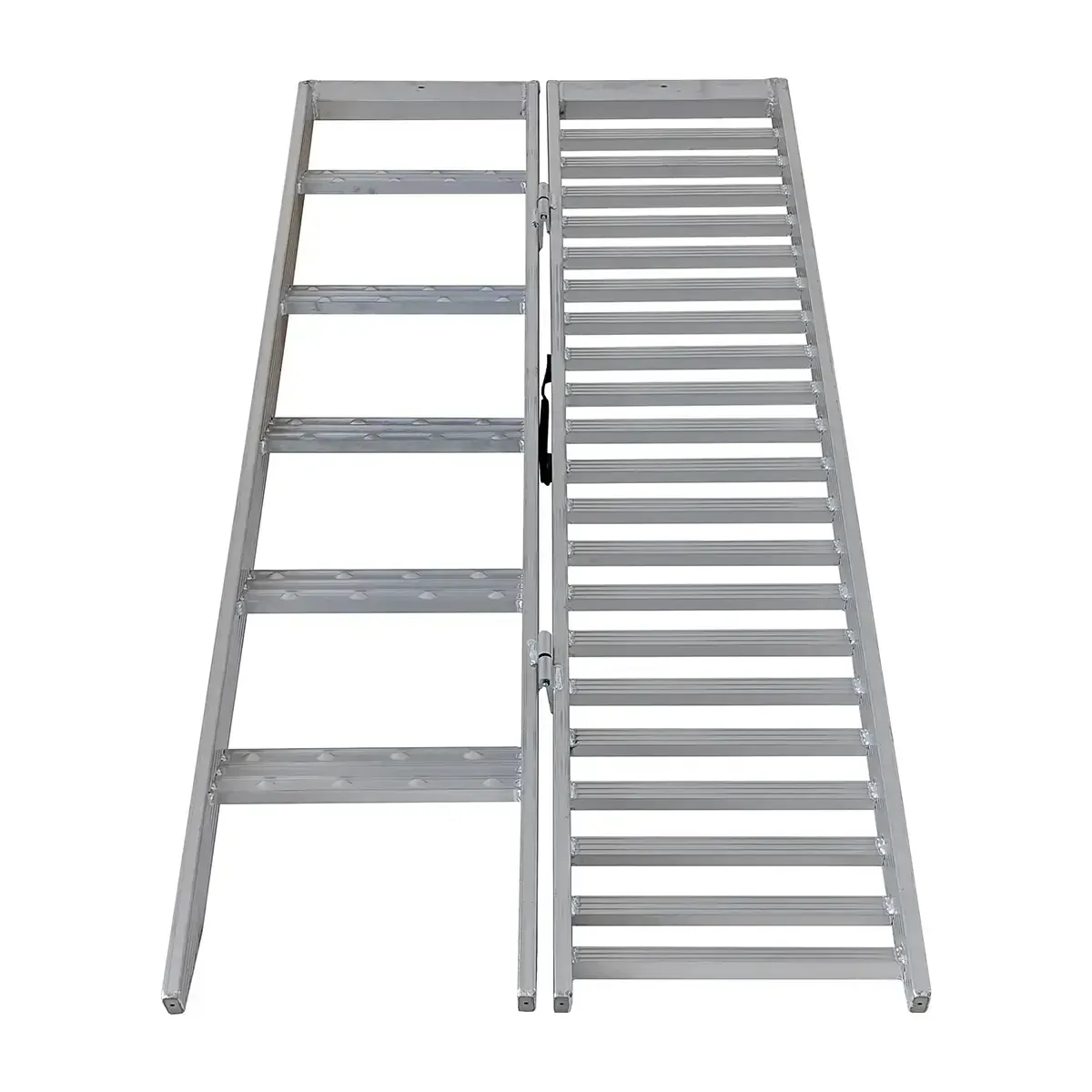 This unique design allows for ease of loading while allowing for maximum balance by use of the step ramp connect via a hinge. Once loaded the dual ramp can be easily folded away.