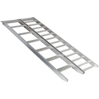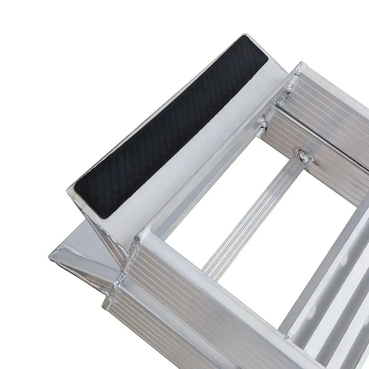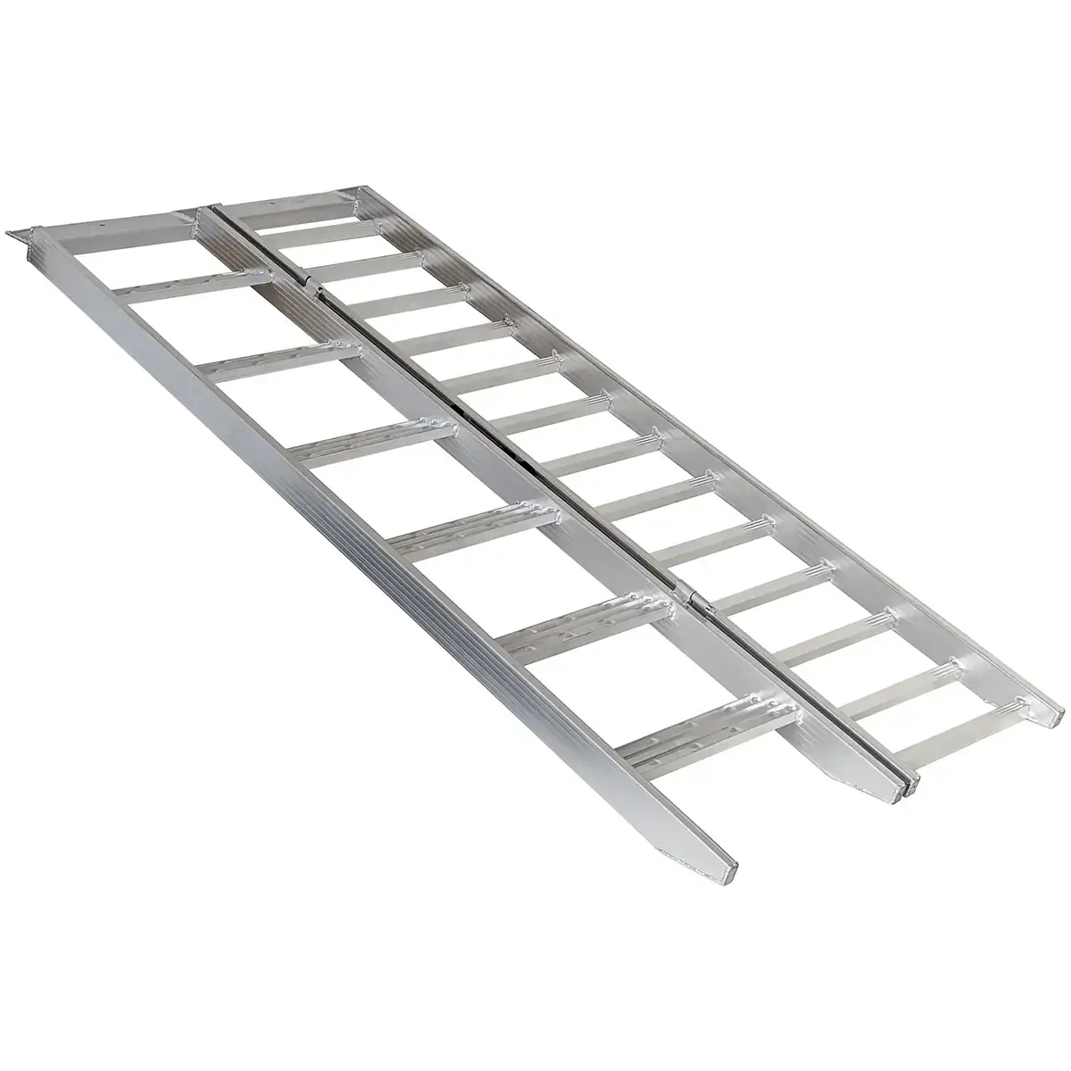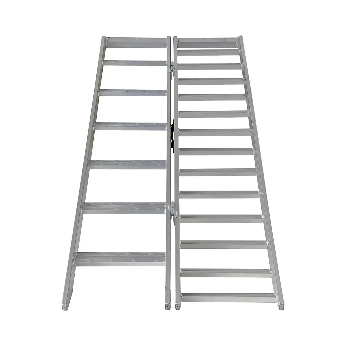 This unique design allows for ease of loading while allowing for maximum balance by use of the step ramp connect via a hinge. Once loaded the dual ramp can be easily folded away.