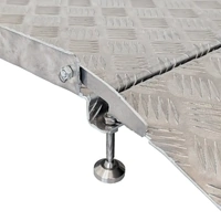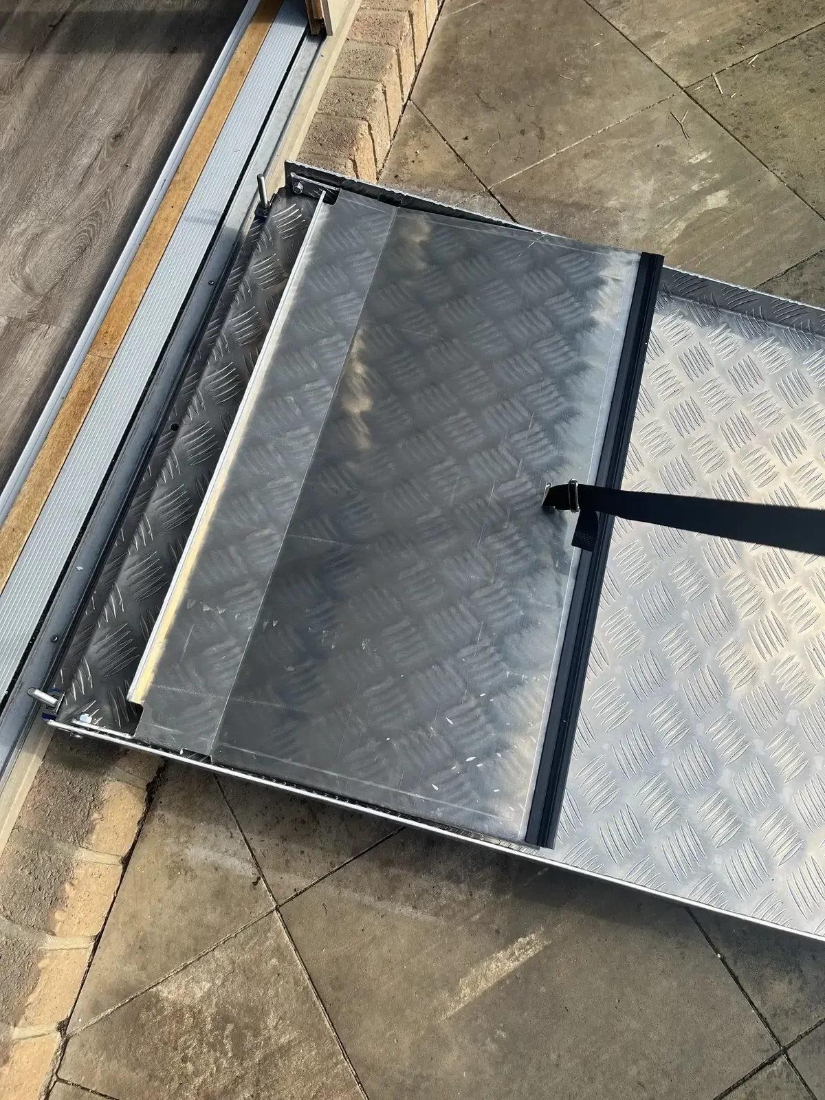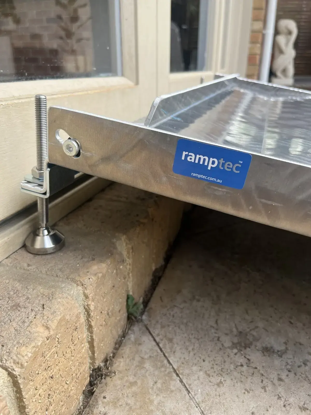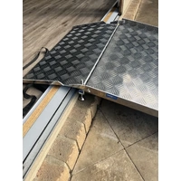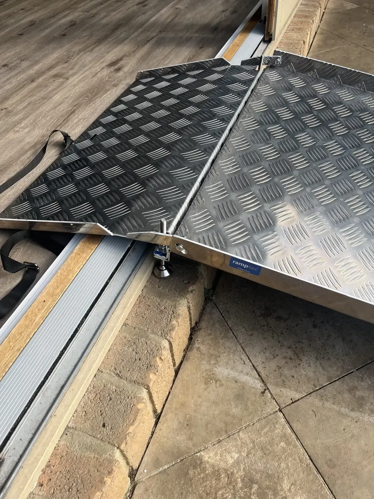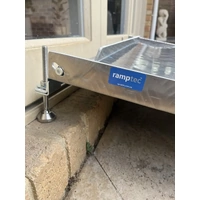 The ramp is hinged allowing the larger section to be adjusted to the threshold height with the second section then lowered allowing a smooth transition over the kerb etc